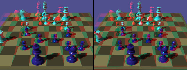 This parabolic distortion is readily apparent in a side-by-side comparison of otherwise identical scenes. The convergence angle on the right stereograph is only about two degrees. Even so, the vertical disparity is at the limit of tolerance (as a rule of thumb, less than one per cent of image height). And can you see the weirdness in the corners as your brain tries to fuse the vertical misalignment? Can you see how the parallel rendering is easier to view? It is my experience that toe-in keystone distortion limits depth before horizontal parallax. That is, you reach intorable eyestrain from vertically twisting the eyes before the images start to split apart from too much camera separation. This is especially a problem with off-screen effects. If you want accurate shapes and maximum stereo effect, you should keep your lenses parallel. Also note how the high-contrast white chess pieces are ghosting pretty badly in the anaglyph, while the lower-contrast board hardly ghosts at all. You should consider this when texturing your objects.