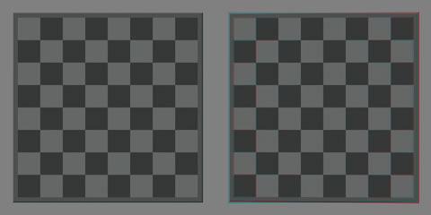 It is not generally realized that toe-in distorts the shape of the stereo field. Both the chessboards above were rendered with identical camera settings, except the chessboard on the left was rendered with parallel lenses and the board on the right with toe-in. I have aligned them to the same zero parallax. Notice how the parallel board appears flat, as it should, while the toe-in board is curved.