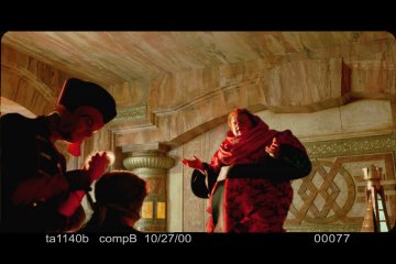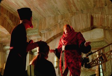 Again with the "floating". Except this time I had a real horrible time of it. Once again the Baron was atop his crane. Only in this shot the camera was also moving. Sometimes for a shot like this a motion controlled camera is used and the exact motions of the camera can be recorded and then duplicated with the actors present. And then the crew shoots just the background with the same EXACT camera moves.